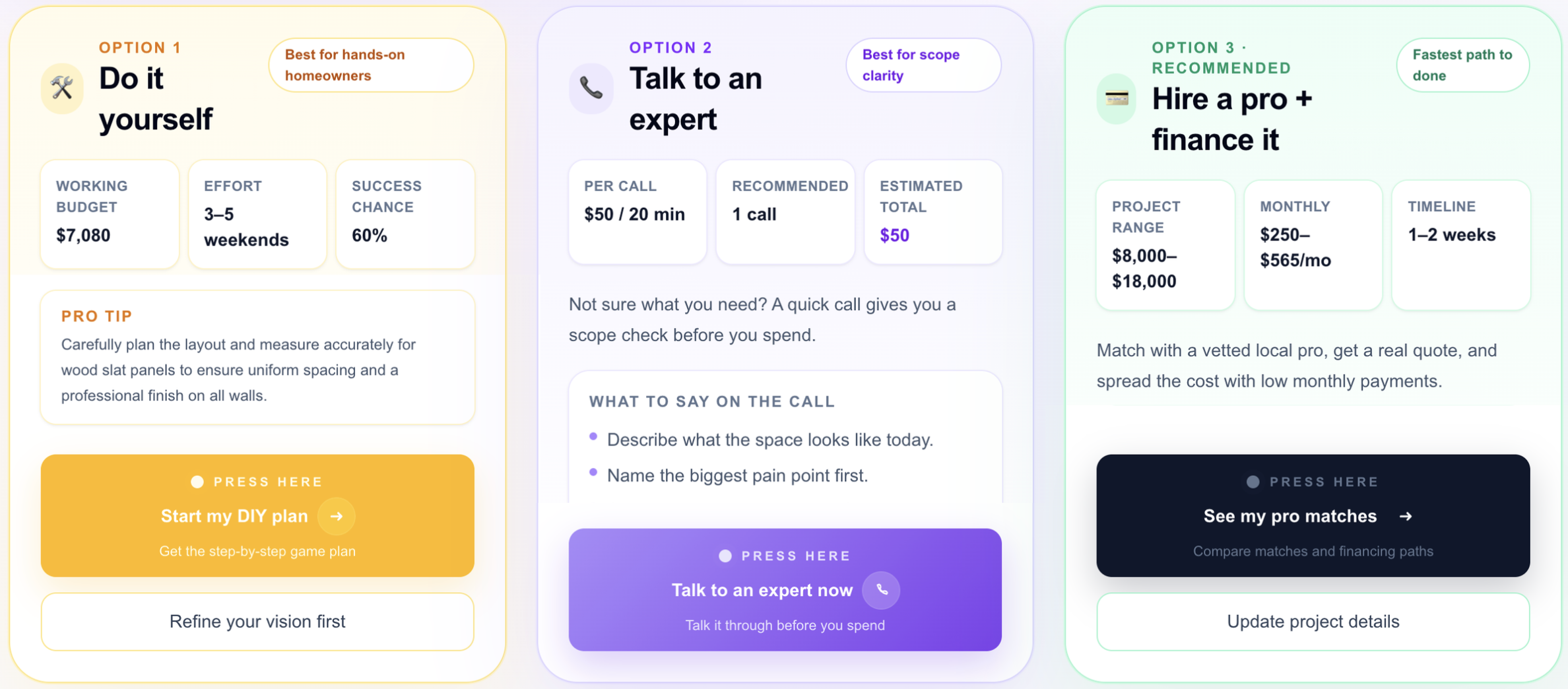 Fixoma turns your idea into a real project — with design, pricing, financing, and booking — all in one place.